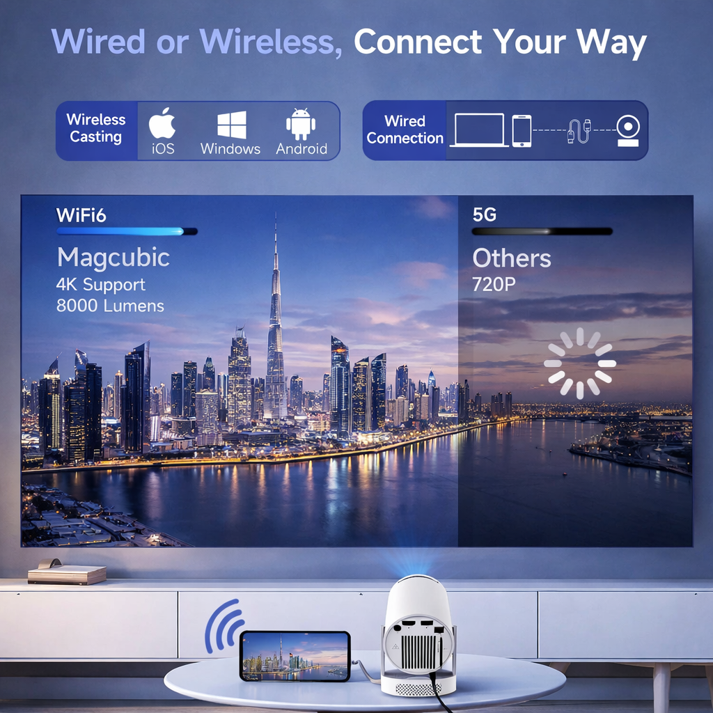 Gracias a su diseño de rotación ajustable de 180°, el proyector se adapta fácilmente a diferentes espacios, desde salas de estar y dormitorios hasta proyecciones en el techo, para una auténtica experiencia cinematográfica. Ya sea que veas películas, transmitas contenido o juegues, el HY300 Pro+ ofrece una experiencia visual fluida e inmersiva con un diseño moderno y minimalista.